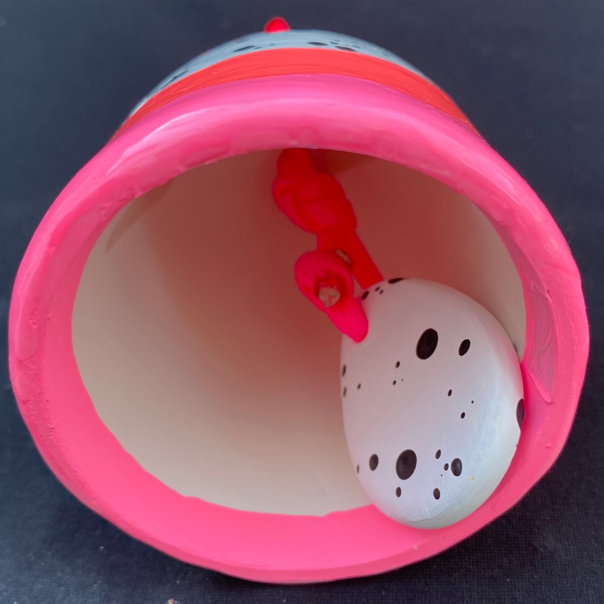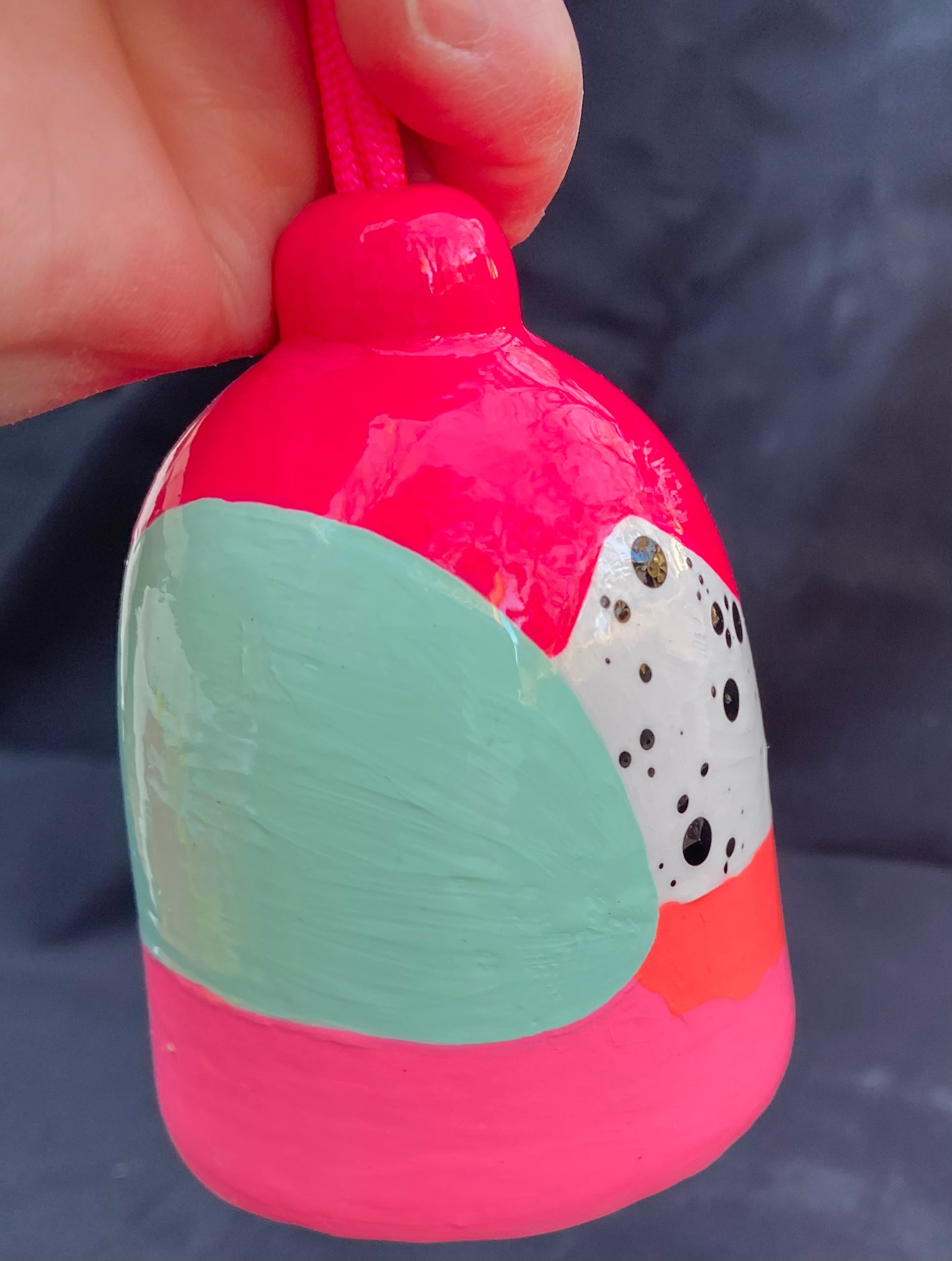 These limited edition one of a kind bells are made of ceramics. Each unique Artifact of Joy Bell is painted in vibrant acrylic paint and sealed with no voc food safe resin for color durability. The handle is neon pink para cord and each ringer is painted in colors and patterns that coordinate with the bell!