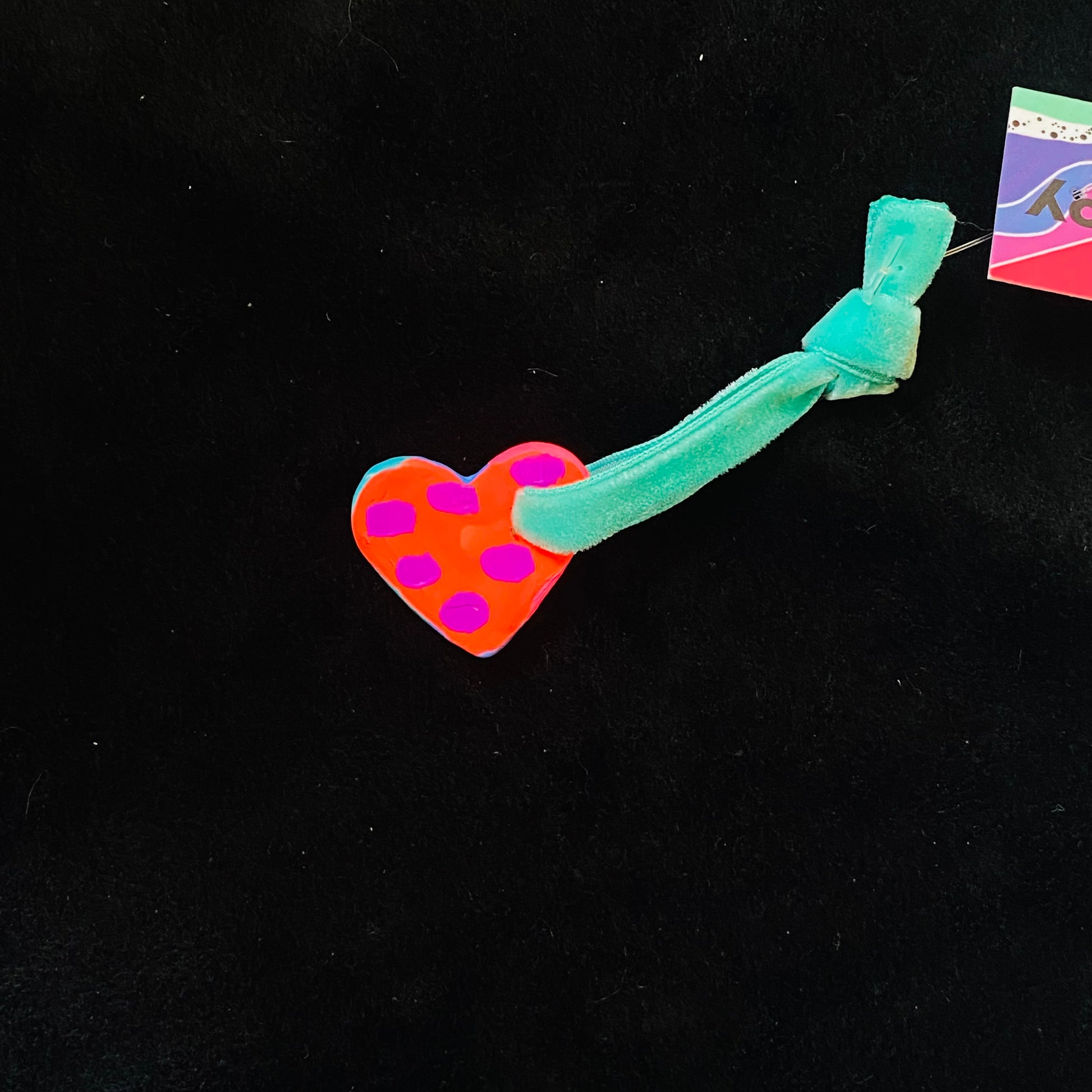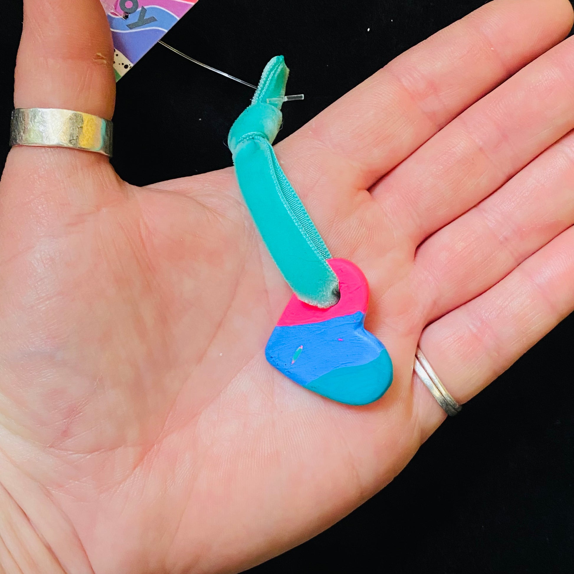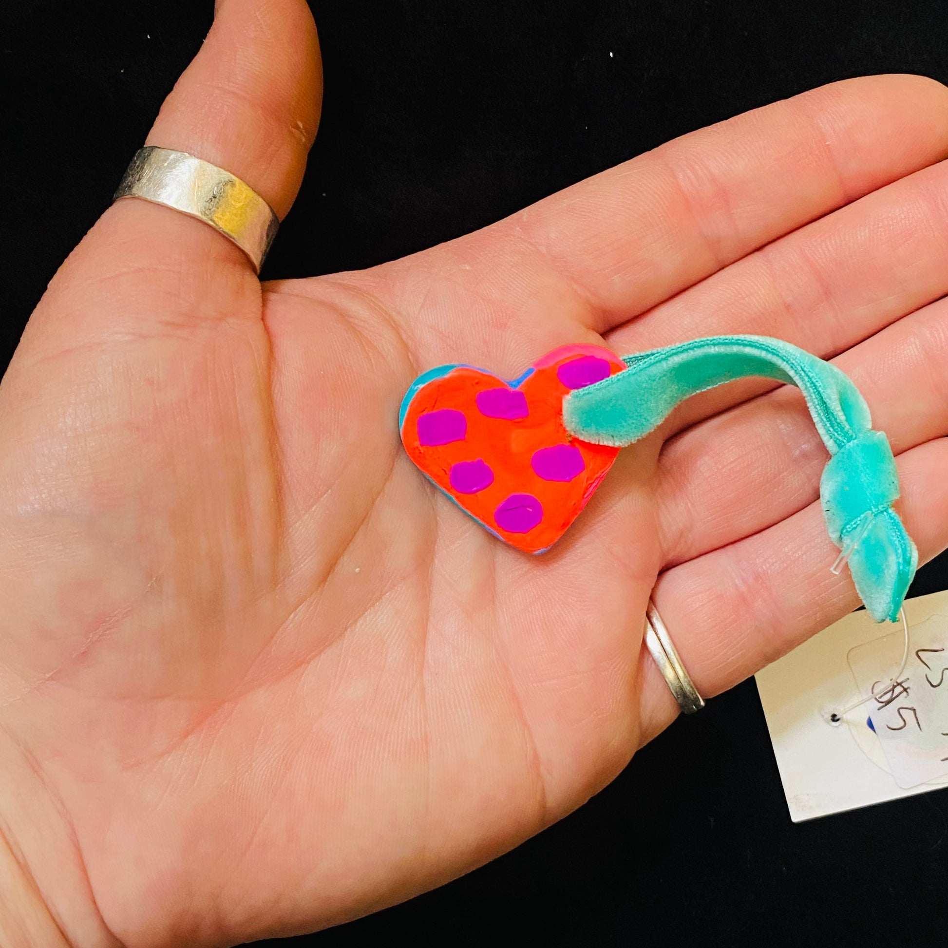These ceramic heart ornaments are hand painted in brilliant acrylics on wood. They measure approximately 1 inch in size with a two inch long velvet ribbon hanger.