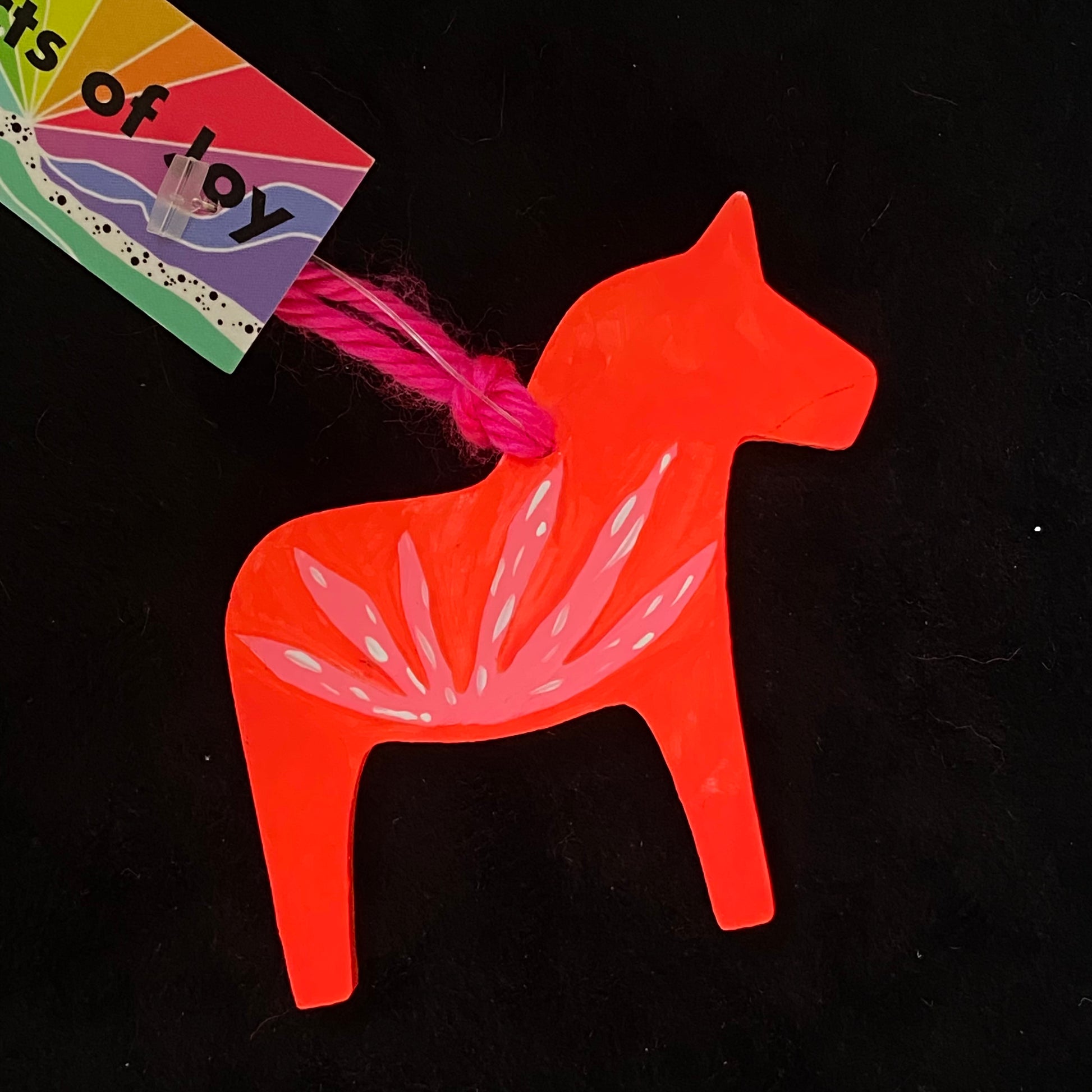 These dala horse ornaments are hand painted in brilliant acrylics on wood. They measure approximately 3 inches in size with a two inch long acrylic yarn hanger.