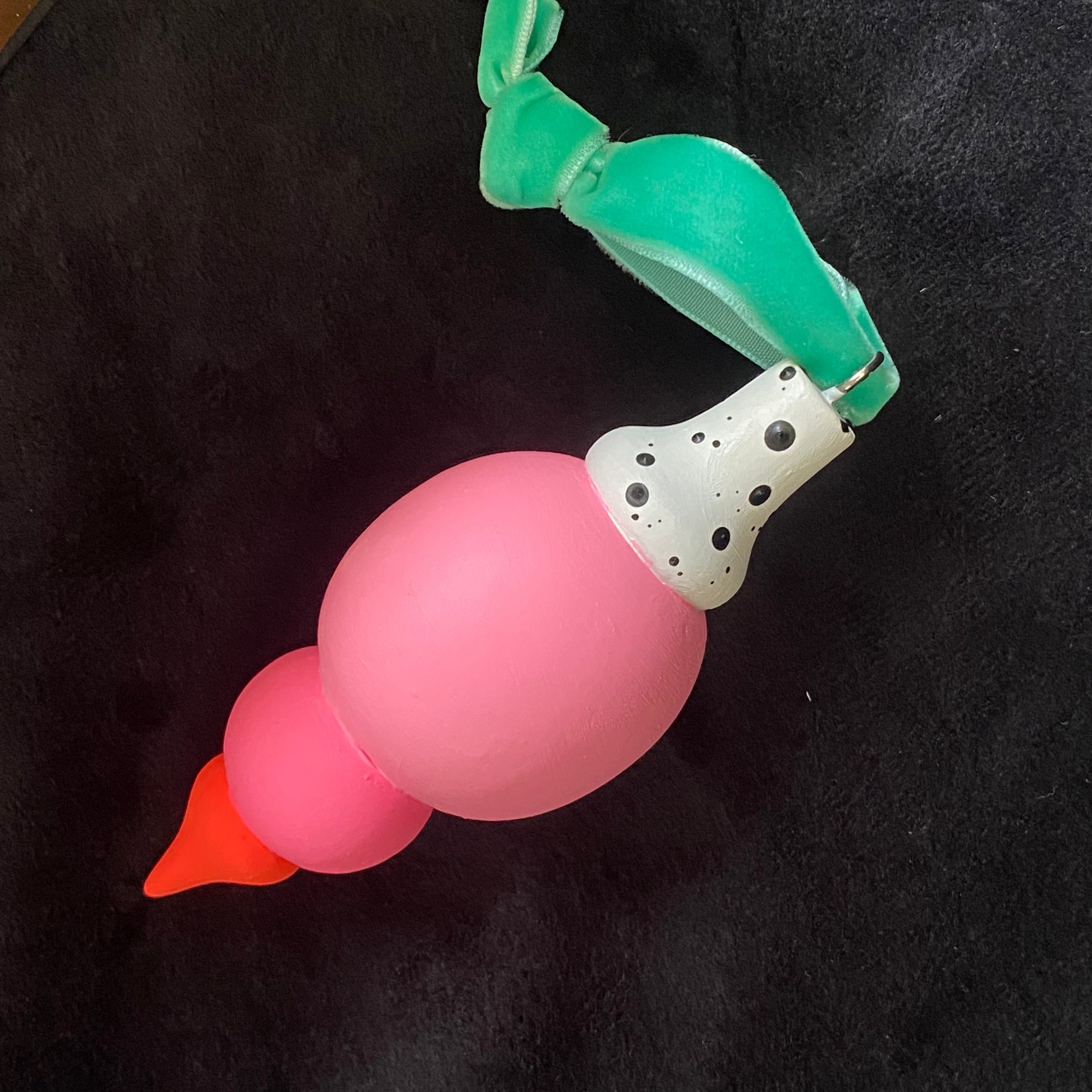 Size: approximately 4.5" long x 1" in diameter at it's thickest. Hand painted in acrylic on wood. The hanger is velvet.