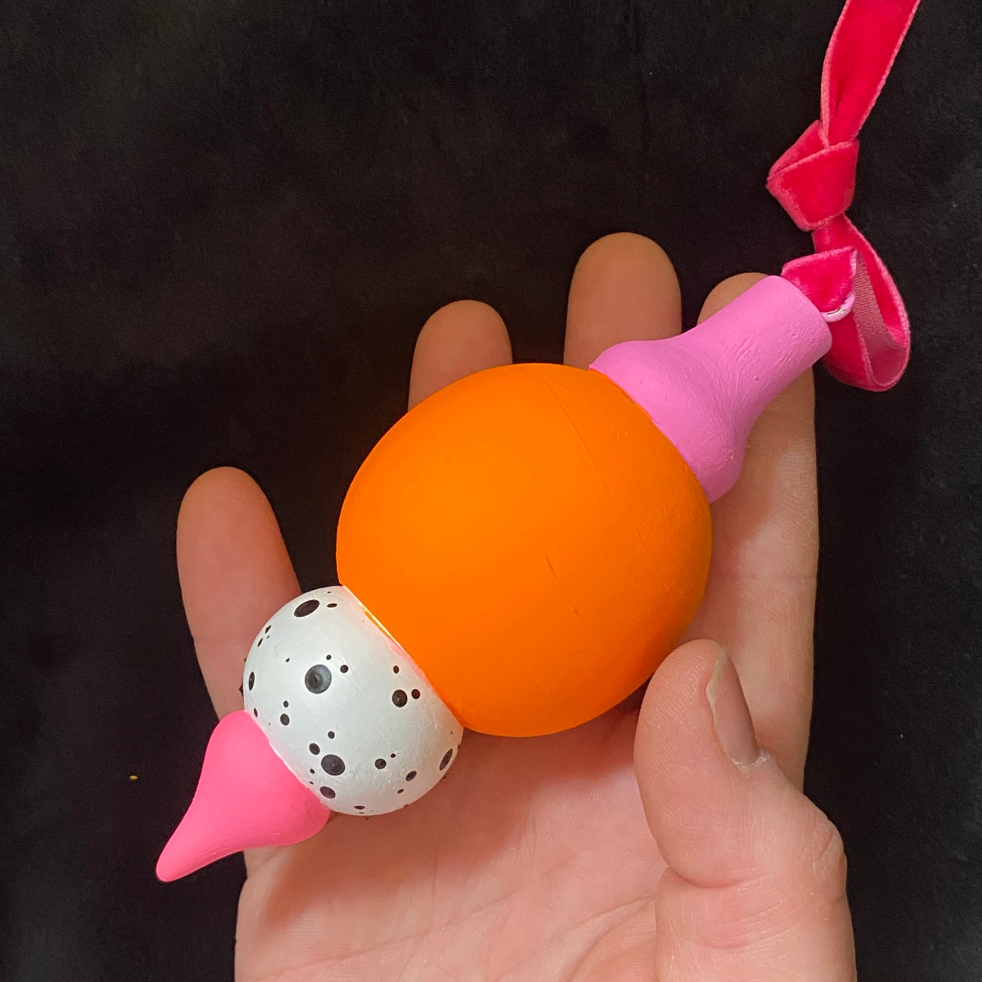 Size: approximately 4.5" long x 1" in diameter at it's thickest. Hand painted in acrylic on wood. The hanger is velvet.