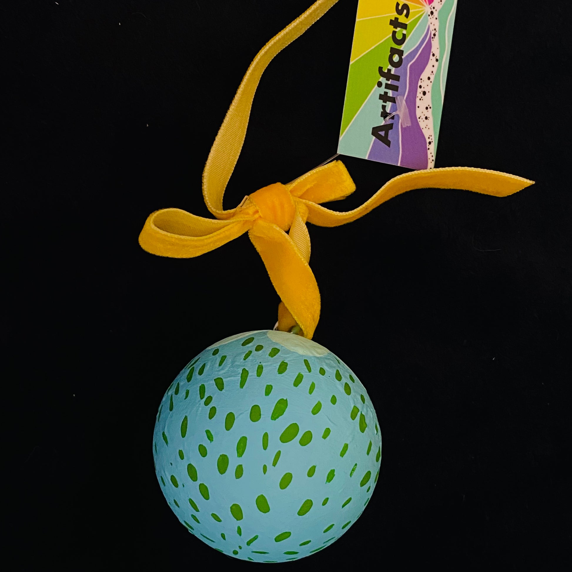 Each ornament is two inches in diameter and made of solid wood. They are hung on a vibrant velvet ribbon. Ornaments are hand painted in matte acrylic.