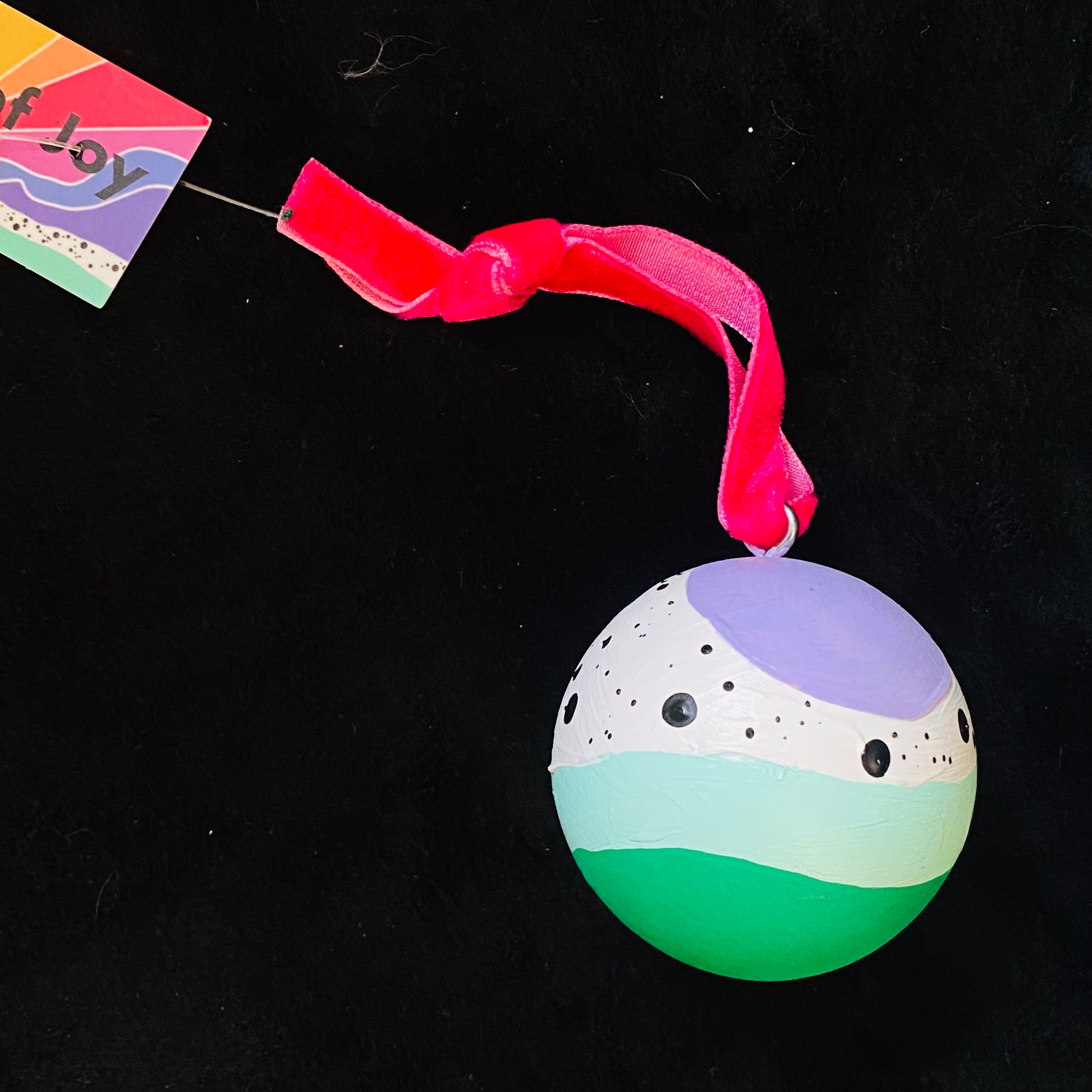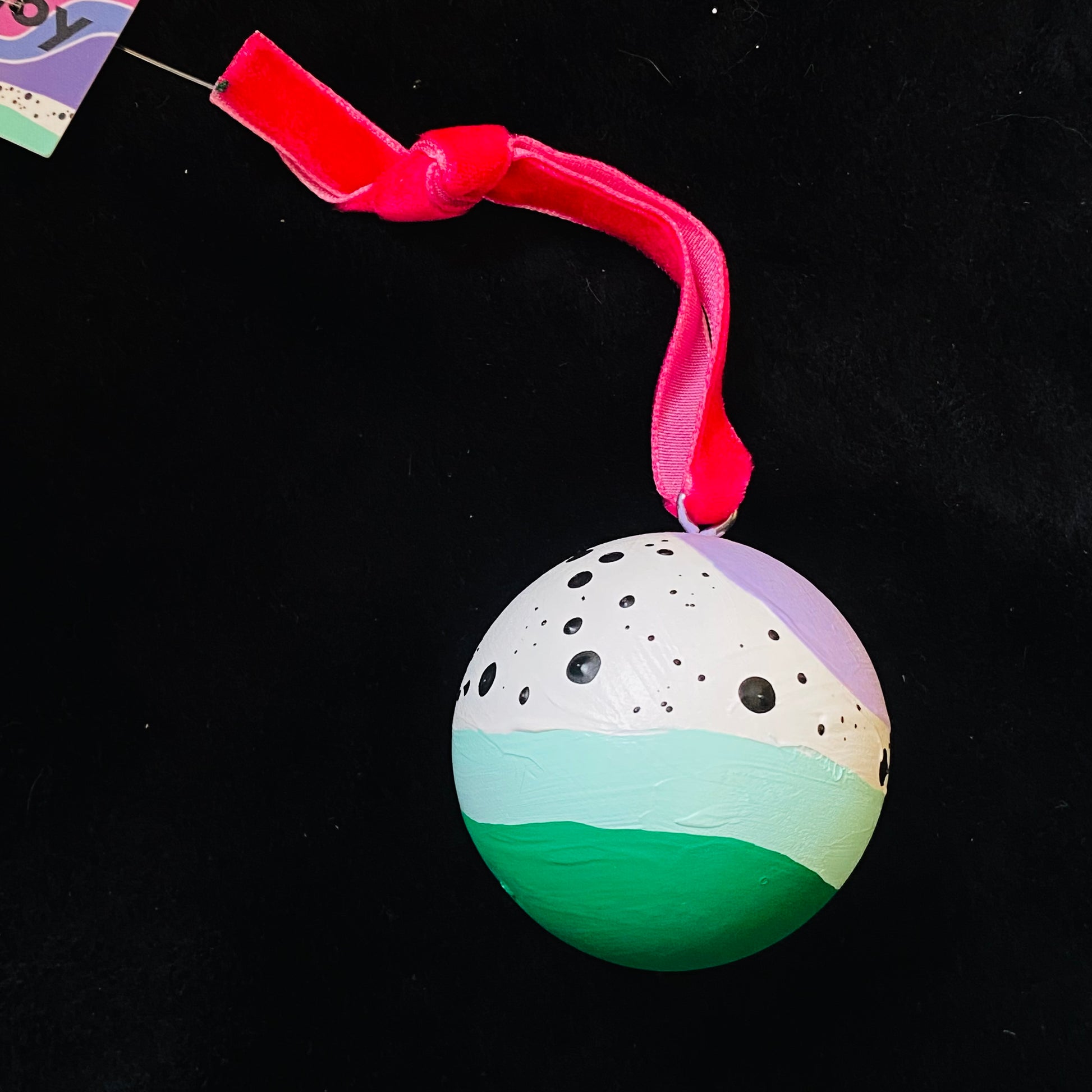 Each ornament is two inches in diameter and made of solid wood. They are hung on a vibrant velvet ribbon. Ornaments are hand painted in matte acrylic.