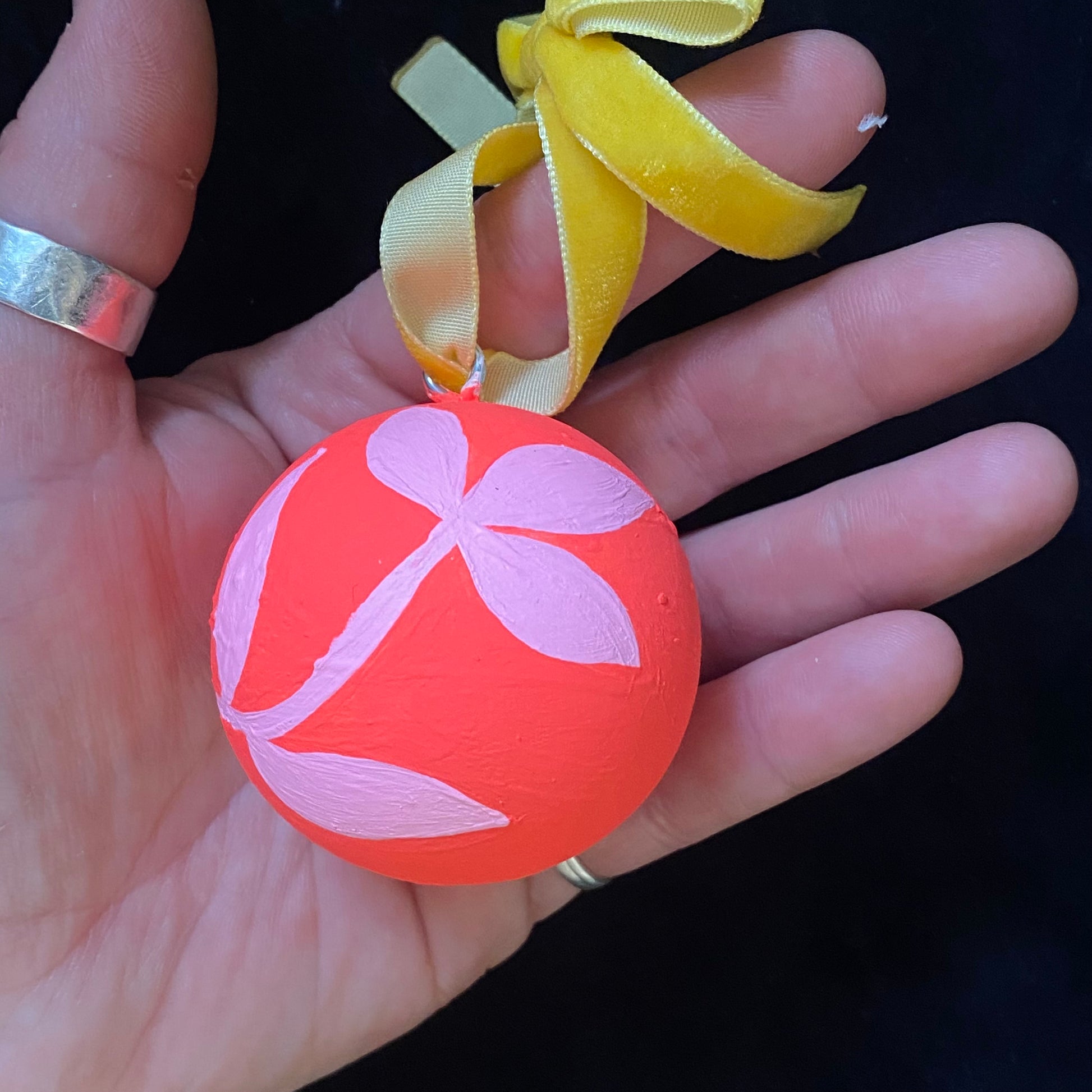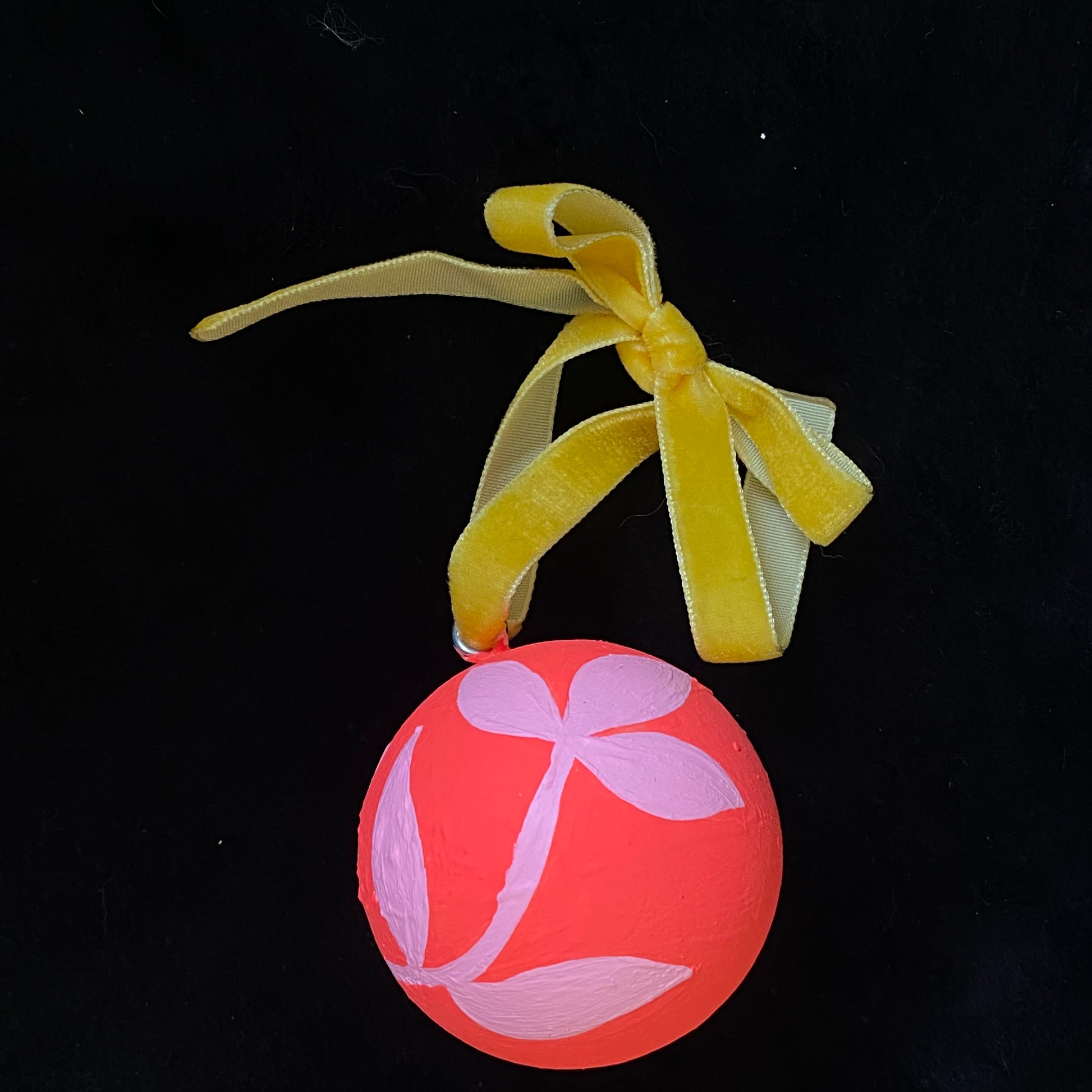 Each ornament is two inches in diameter and made of solid wood. They are hung on a vibrant velvet ribbon. Ornaments are hand painted in matte acrylic.