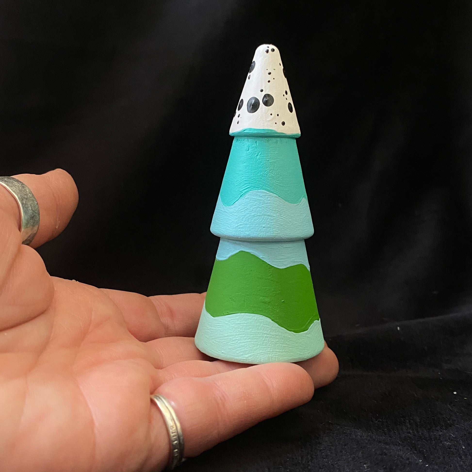 Each wooden tree stands three inches tall. They are hand painted in matte acrylic paint. No two will even be exactly the same.