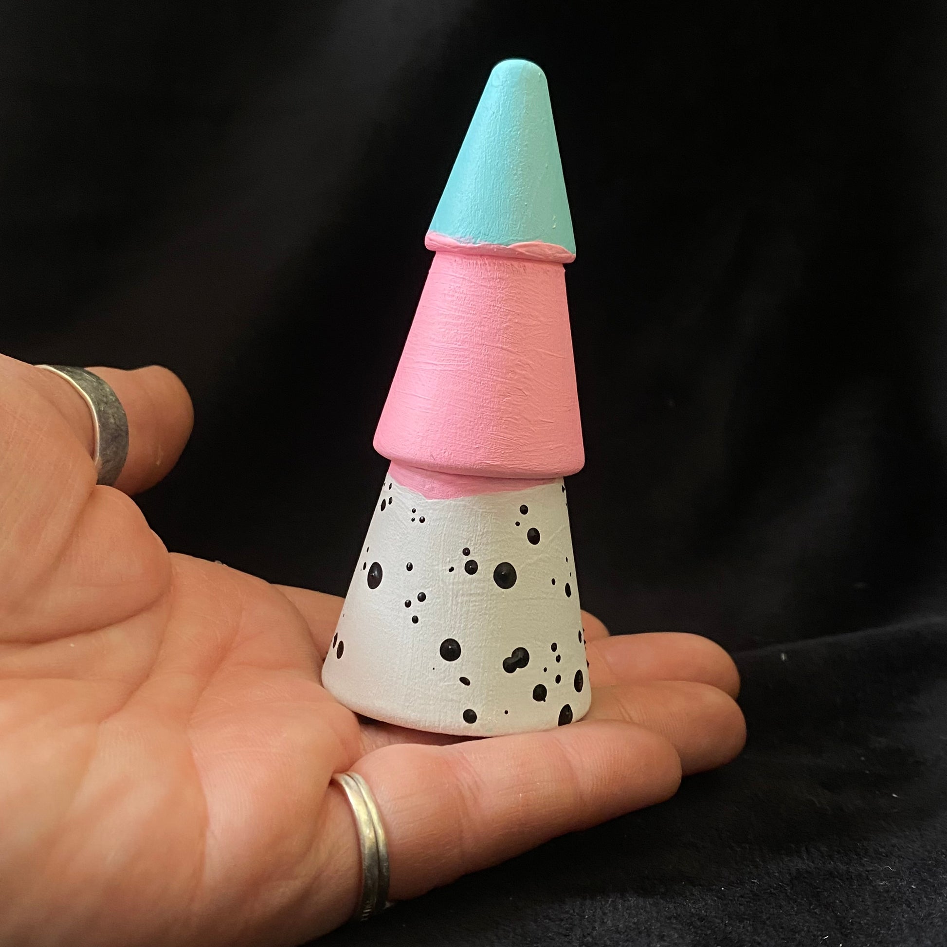 Each wooden tree stands three inches tall. They are hand painted in matte acrylic paint. No two will even be exactly the same.
