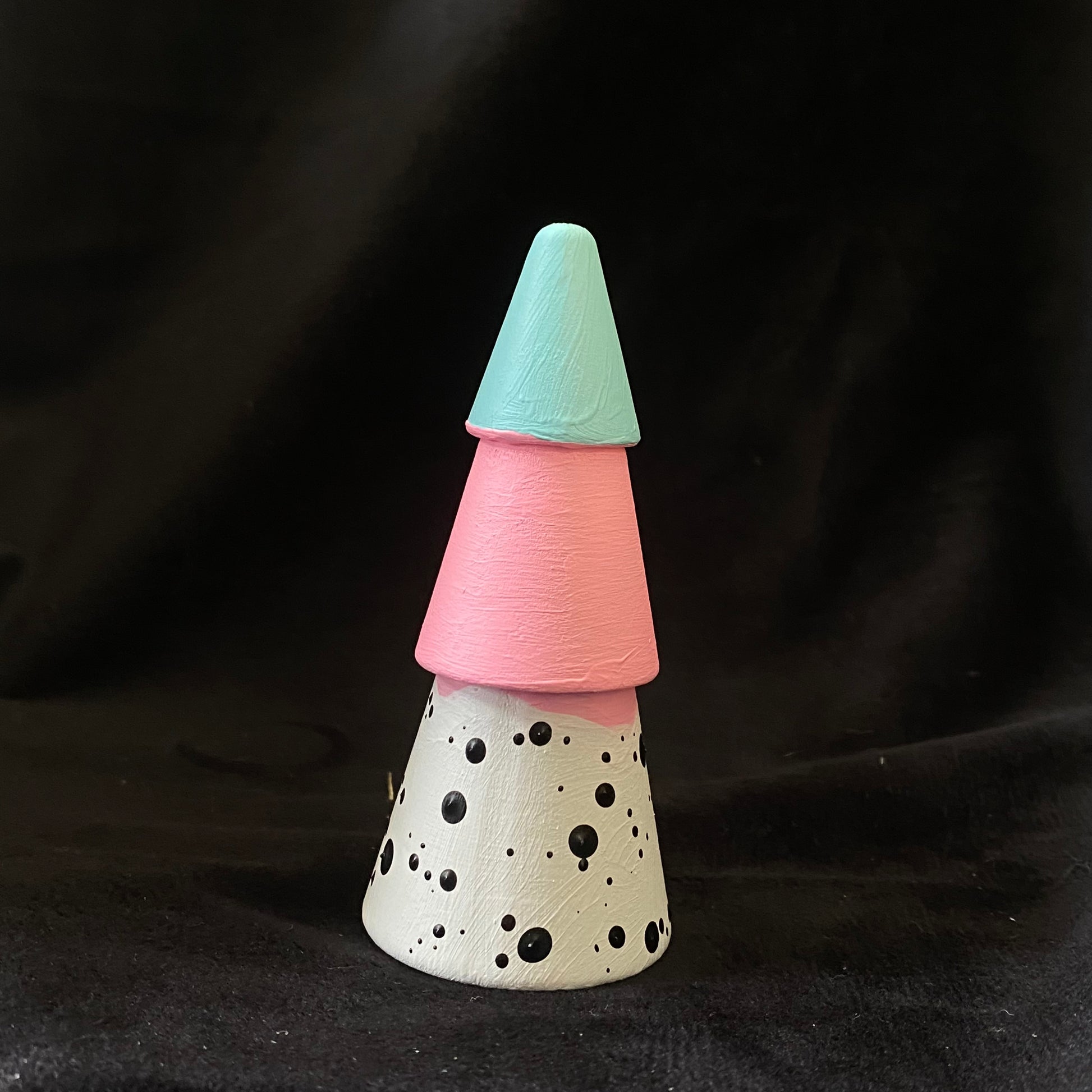 Each wooden tree stands three inches tall. They are hand painted in matte acrylic paint. No two will even be exactly the same.
